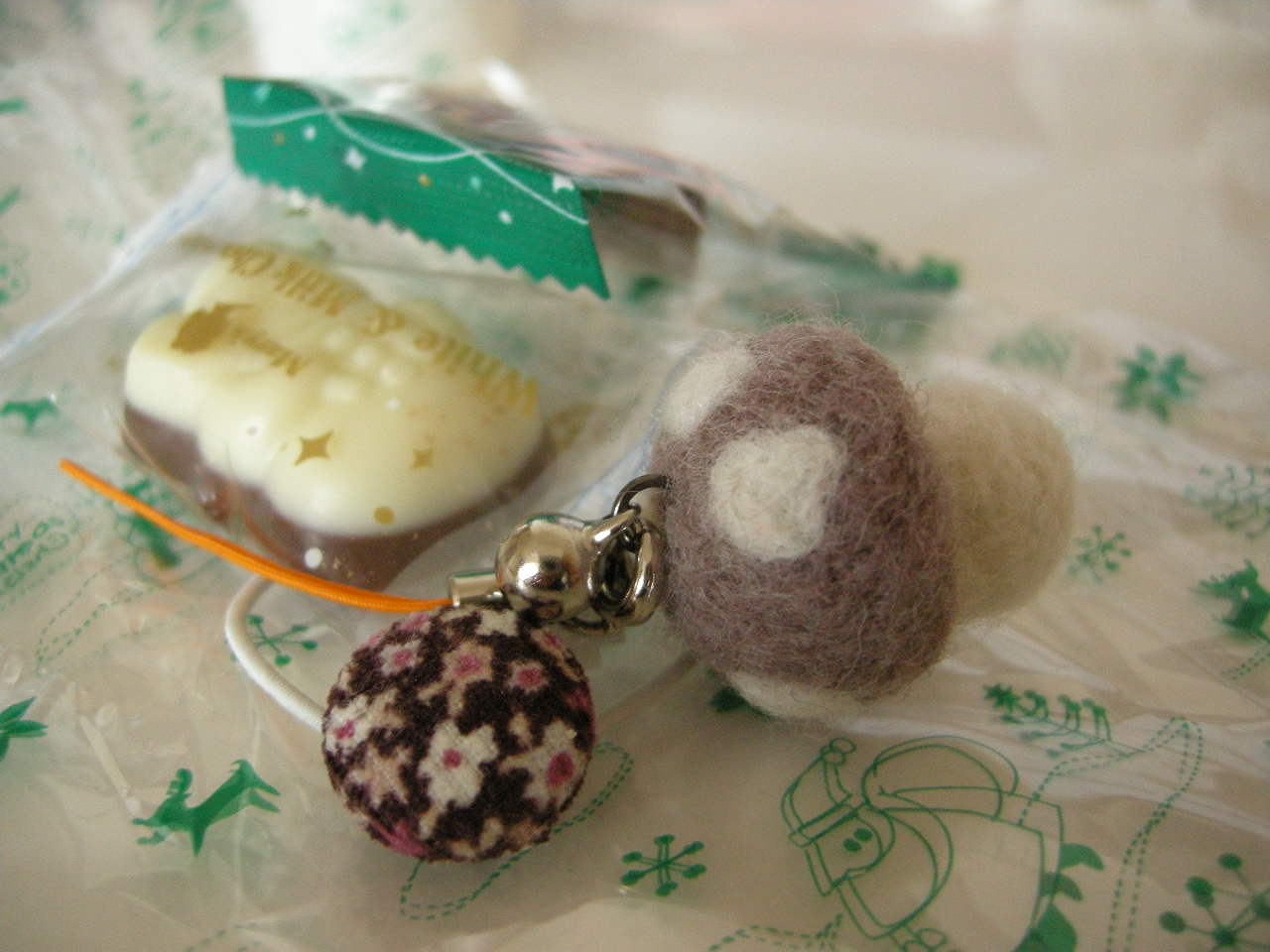 中にはブログで見て可愛いと思っていた羊毛きのこのストラップとくるみボタンとチョコレートとメッセージカードが…