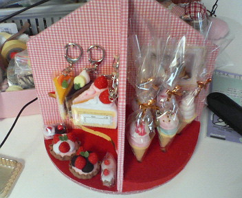 ケーキキーホルダー4個・アイスクリームストラップ3個・ソフトクリームストラップ2個・タルトマグネット2個・ミニケーキマグネット2セットです。品物を飾っておく台もテキトーですが・・作ってみました